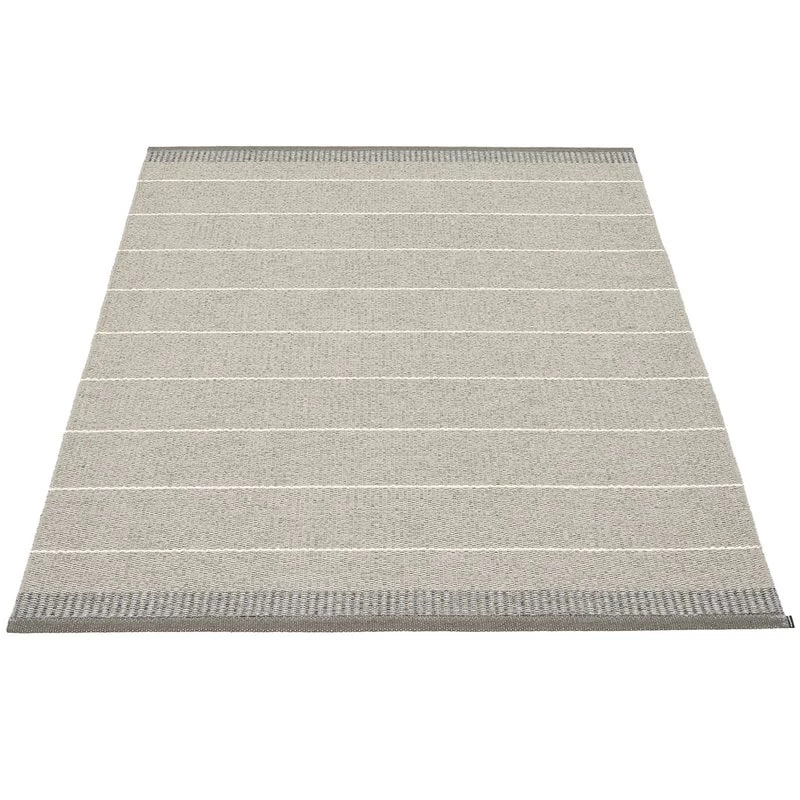 Der vom schwedischen Teppichhersteller Pappelina entworfene Teppich Belle zeichnet sich durch den Kontrast von hellem Hintergrund und dünnen Streifen aus. Die doppelt gefalteten Kanten sind mit einer starken Naht gesäumt.