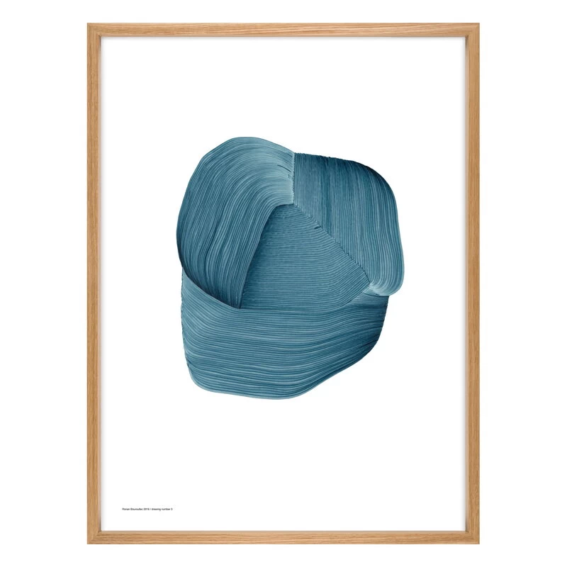 Ronan Bouroullecs Drawing-Poster zeigen Textmarker-Striche, die fließende, abstrakte Formen mit einem faszinierenden Gefühl von Tiefe und Dimension erzeugen. Für Bouroullec ist das Zeichnen ein entspannender, ja meditativer Prozess. Er lässt den Filzstift in seiner Hand frei und intuitiv auf das Papier fließen, ohne die Formen vorher zu planen. Daher haben die Formen keinen eindeutigen Anfang und kein eindeutiges Ende, was eine Vielzahl von Interpretationen hervorbringt.
