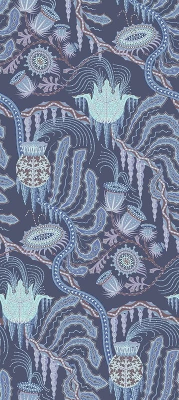 Auf der Ice Palace-Tapete von Klaus Haapaniemi aus der Kollektion Polar Byzantine ist ein kühlendes Muster aus Eiszapfen und bereiften Pflanzen abgebildet. Klaus Haapaniemi, einer der großen Namen des zeitgenössischen finnischen Designs, hat eine Tapetenkollektion mit intensiven Farben und kräftigen Mustern entworfen, die von der nordischen Natur und Mystik inspiriert sind.