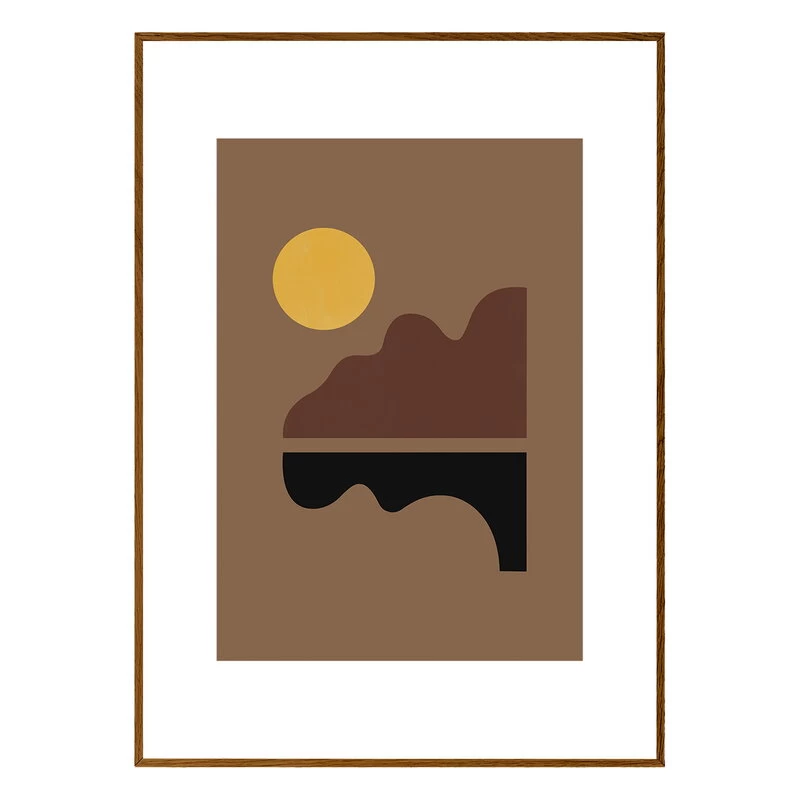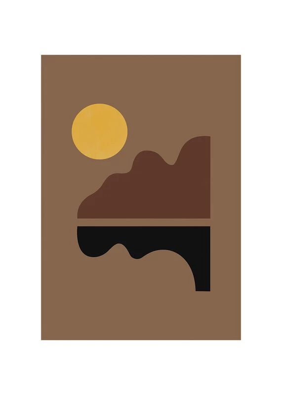 Das Malibu-Poster von Paper Collective lädt Sie auf eine Reise in die kalifornische Landschaft ein: In seinen abstrakten Formen sind die Silhouetten von Klippen, dem Meer und der Sonne zu erkennen. Die dunklen Orange-, Gelb- und Schwarztöne lassen aber auch Raum für eigene Interpretationen in Bezug darauf, was die Komposition des Künstlers Denis Boudart darstellen könnte.