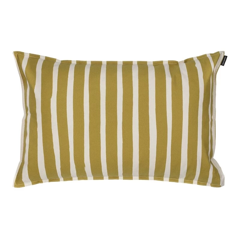 Den Kalasääski-Kissenbezug von Marimekko ziert ein zeitlos elegantes Motiv aus vertikalen und diagonalen, handgemalten Streifen, das von Maija Isola im Jahr 1962 entworfen wurde. Der aus Baumwolle gefertigte und in harmonischen Olivgrün- und Naturtönen gehaltene Kalasääski-Kissenbezug verleiht dem Wohn- oder Schlafzimmer einen frischen Hauch von nordischem Design.