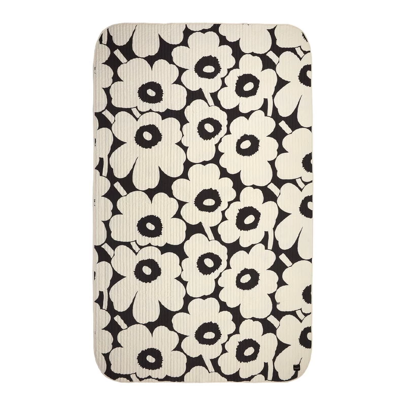 Der Unikko-Bettüberwurf von Marimekko zeigt das ikonische Blumenmuster von Maija Isola in Anthrazittönen und ungebleichter Baumwolle. Der gesteppte Unikko-Bettüberwurf ist mit leichter und voluminöser Watte gefüllt, wodurch er luxuriös und einladend wirkt.