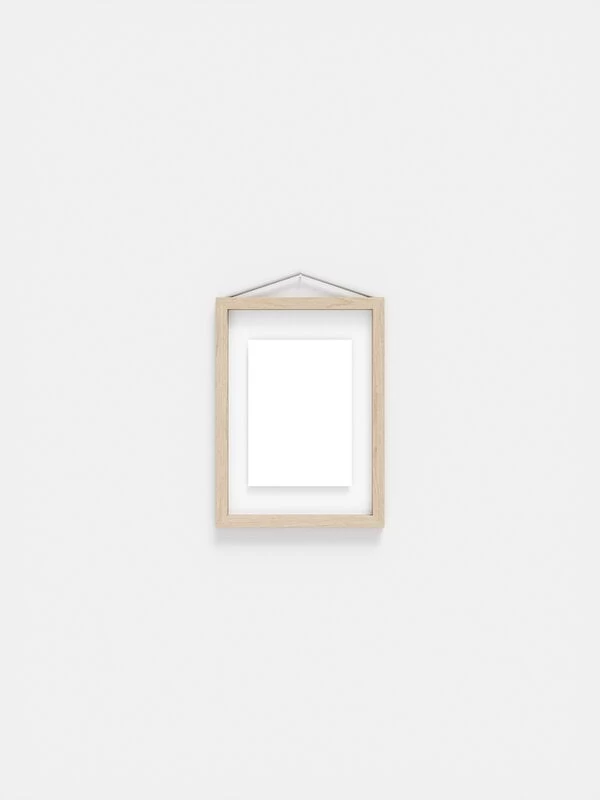 Der Bilderrahmen mit offener Rückseite von Moebe besteht aus vier Eschenholzleisten, zwei Acrylglasplatten und einem langen Gummiband, das die Teile zusammenhält und als Aufhänger fungiert. Der Rahmen ist perfekt geeignet, um alles Flache und Zweidimensionale zu präsentieren, von gepressten Pflanzen, Fotos und Zeichnungen bis hin zu den transparenten Floating Leaves-Postern von Paper Collective.