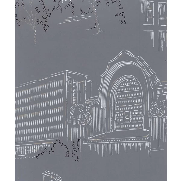 Die Tapete Helsinki zeigt ein charmantes Muster aus den 1950er Jahren, das Wahrzeichen der finnischen Hauptstadt vom Hauptbahnhof bis zum hohen Turm des Olympiastadions abbildet.
