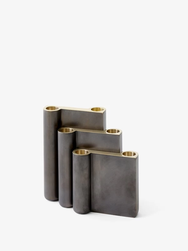 Der Collect-Kerzenständer von &Tradition bietet einen skulpturalen und stilvollen Rahmen für zwei Spitzkerzen. Der Kerzenständer ist aus gegossenem Messing gefertigt und bronziert. Seine Oberseite wurde poliert, um eine glänzende Messingoberfläche zu schaffen, die mit der Zeit eine schöne Patina erhält.