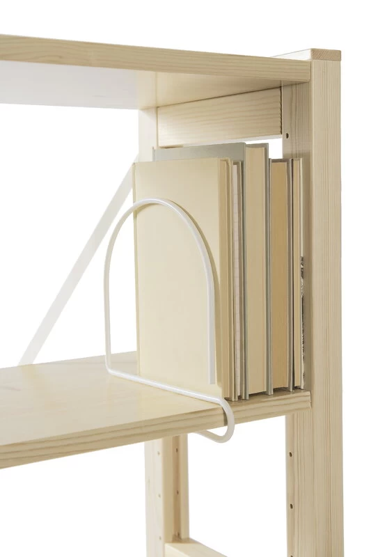 Die Buchstütze Wire von Lundia ist eine schlichte, minimalistische Lösung für die Organisation Ihres Bücherregals. Die Buchstütze ist aus dickem Metalldraht gefertigt, der zu einer geometrischen Form gebogen wurde. Sie können die Buchstütze mit allen Regalböden mit einer Stärke von 15–25 mm verwenden, wie z. B. den Classic-Regalen von Lundia. Die Buchstütze wird am Regal befestigt, indem sie einfach auf den Rand des Regalbodens geschoben wird.